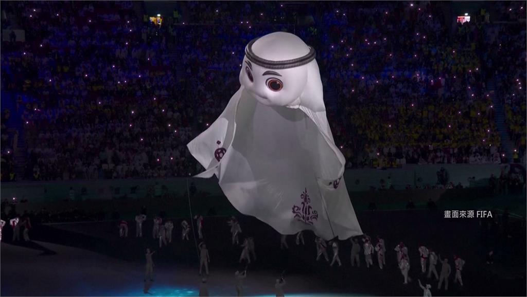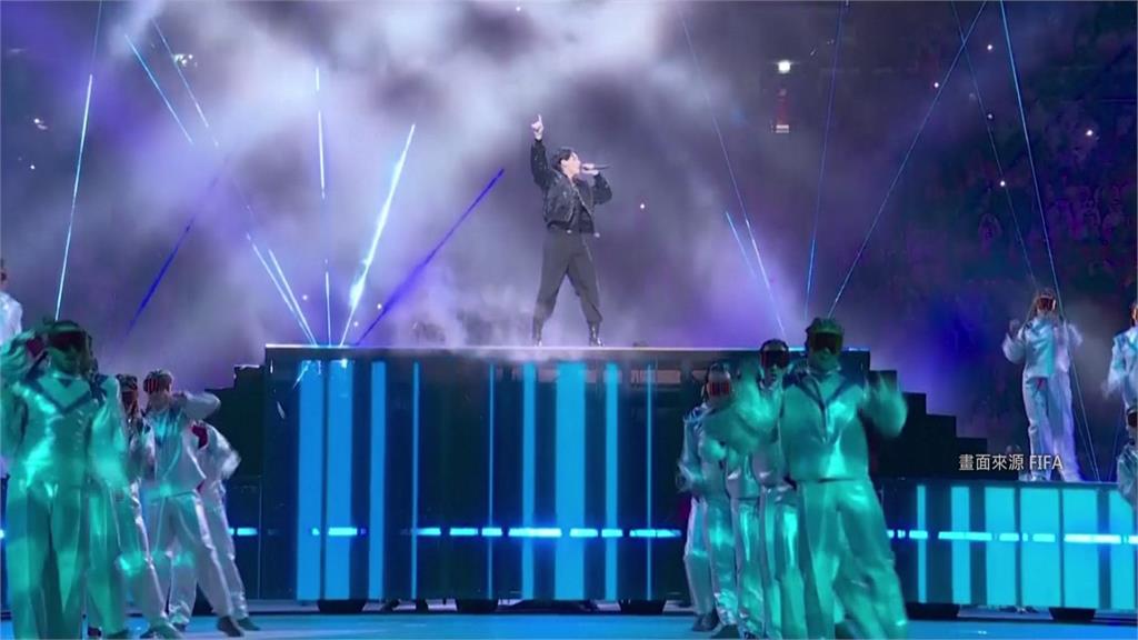 田柾國在世足開幕式上勁歌熱舞。圖/翻攝自FIFA以阿拉伯傳統頭飾為設計概念的吉祥物「拉衣卜」也盛大登場。知名演員摩根費里曼和天生殘疾的穆夫塔也引言開場,摩根費里曼先是向觀眾打招呼,而穆夫塔在引言中表示「我們發出邀請,因為我們歡迎所有人,這是對世界的邀請」。
