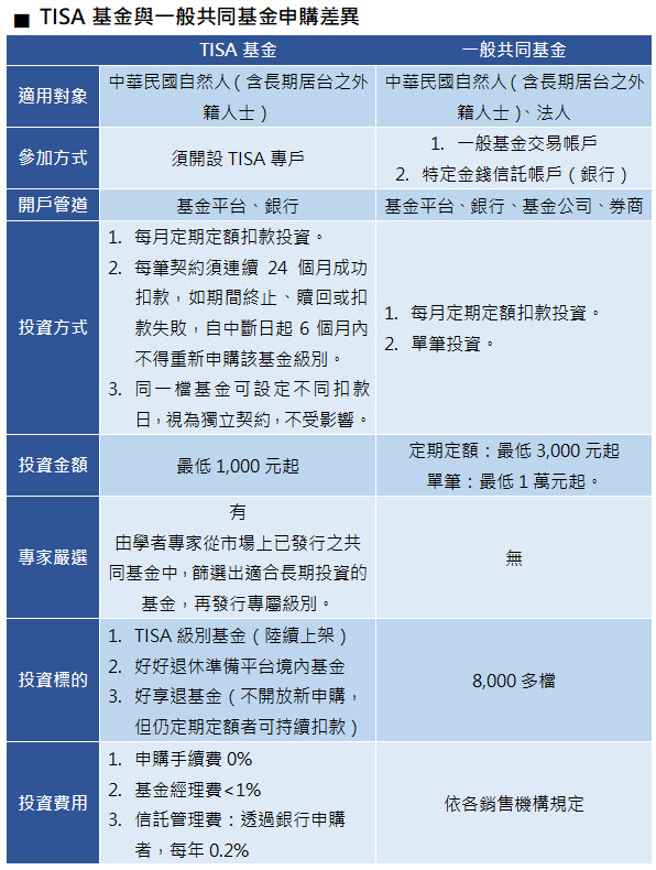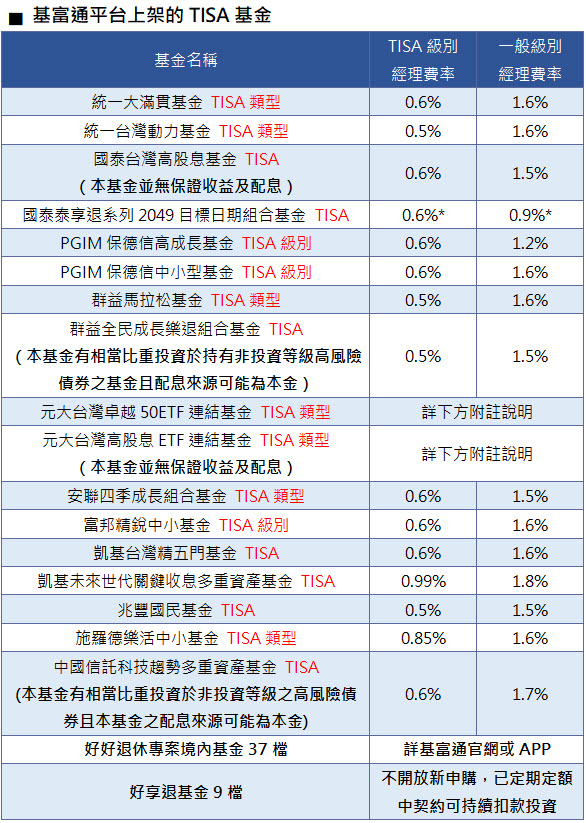 除了「TISA好享投」之外,基富通「好好退休準備平台」服務今年持續升級,新增景順多元收益成長基金、景順環球股票收益基金、施羅德環球創新股票基金,境外基金數量達到23檔,同樣有專家把關、費用低廉,加上小額保險商品與全平台總計近5,000檔基金,將能補足TISA僅境內基金的不足之處,滿足民眾一站理財與資產配置需求。
