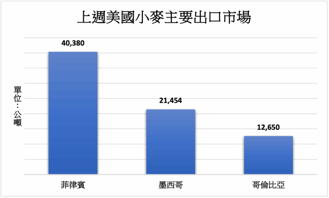 美國農業部11月14日公佈的每週出口檢定報告顯示,截至11月10日當週,美國小麥一週出口檢定量為76,408公噸,佔穀物出口總量的3%;較前週減少58%,較上年同期減少31%,主要出口市場為菲律賓(40,380公噸)、墨西哥(21,454公噸)與哥倫比亞(12,650公噸)。自6月起的2022/23年度小麥累計出口量年減4%至9,905,517公噸。美國農業部11月報告預估2022/23年度小麥出口量將年減70萬噸至2,110萬噸。