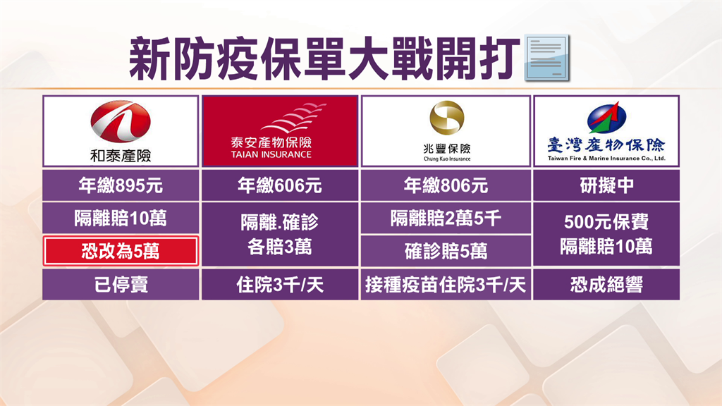 泰安產險年繳606元,隔離和確診各賠3萬;兆豐推出「防疫+疫苗」保單,年繳806元,隔離就有2萬5千元理賠金;至於台產目前還在研擬中,但先前的防疫神單將成絕響。