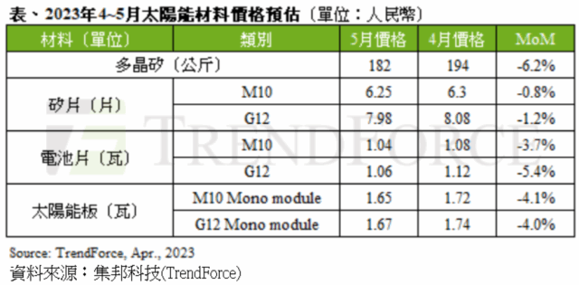 太陽能板方面,儘管上游矽料價格降至每公斤200人民幣以內,但成本下降帶來的利潤空間多被截流在矽片和電池片環節,故太陽能板價格暫時尚未明顯下滑,實際成交價仍維持在每瓦約1.75人民幣。但從近期招標專案的太陽能板報價來看,部分廠商為了銷售而低價搶單,故基本都已降至每瓦1.7人民幣以下,TrendForce預計至第三季太陽能板價格才會全線回歸正常區間,每瓦約1.6人民幣。