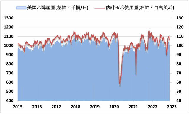 美國農業部11月報告上調玉米產量產量預估,乙醇消費量的預估則維持不變。自9月起的2022/23年度,美國玉米產量預估為139.3億英斗,較前月的預估上調3,500萬英斗,但與上年度產量相比仍將減少7.6%。乙醇消費量預估與前月相同為52.75億英斗,較上年度將減少5,100萬英斗或約1%。