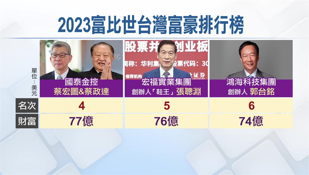 2023年「富比世」台灣富豪排行榜出爐,富邦集團蔡明忠和蔡明興兩兄弟,儘管財富縮減8%到88億美元,約新台幣2694億元,不過時隔5年還是重回榜首。由於去年台灣科技股大跌,讓企業老闆淨資產縮水,導致今年排名大洗牌。